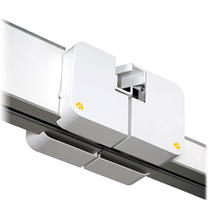 The Guldmann Positioning lock actually consists of three small locks: one for the ceiling hoist in the traverse rail and two for the parallel rails – i.e. one on each rail. A single version of the positioning lock is also available, comprising just one lock to secure the lifting motor in a single rail system.