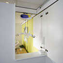 With an “over the wall rail system” you have complete coverage and effective direct transfer from room to room, e.g. from bedroom to bathroom. When not in use the system is almost invisible, as the lifting module, lifting hanger and sling can be stored in the cupboard. The lifting module can be reached from both rooms as the cupboard can be opened from both sides of the wall.